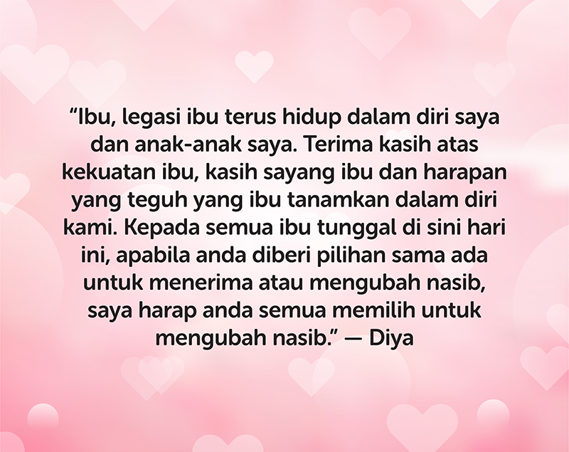 Sepuluh tahun kemudian, Diya berdiri di hadapan khalayak sambil membacakan surat ibunya itu. Diya, kini sudah berkahwin dan mempunyai dua orang anak, menceritakan bagaimana keberanian ibunya melalui Program Kasih Ibu Tunggal (PROKIT) telah mengubah hidup mereka.
