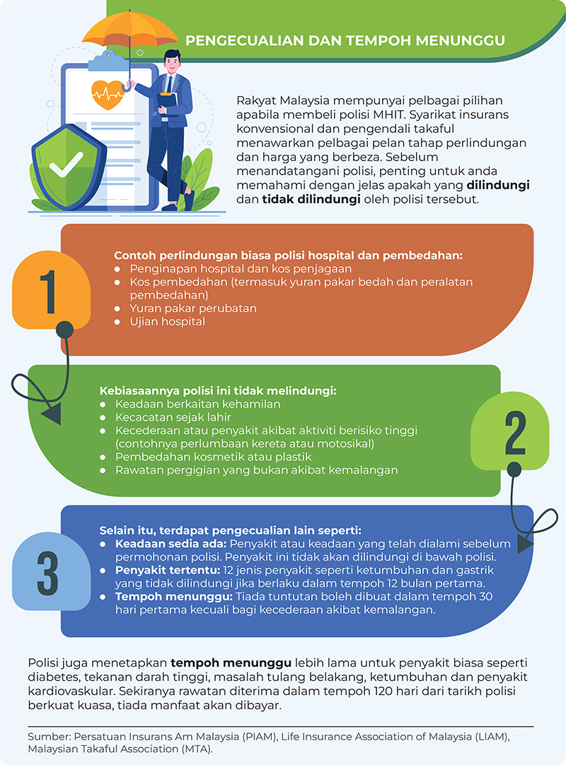 Jika masih kurang pasti, rujuklah syarikat atau ejen yang sah untuk mendapatkan penjelasan lanjut. Memilih dan memiliki polisi MHIT yang sesuai untuk anda dan keluarga bukan sahaja memberi ketenangan minda, malah membantu melindungi simpanan anda. Satu lagi nasihat penting: lakukan semakan dan penilaian semula terhadap polisi MHIT anda setiap dua hingga tiga tahun untuk memastikan perlindungan anda kekal relevan dengan kadar inflasi perubatan semasa.