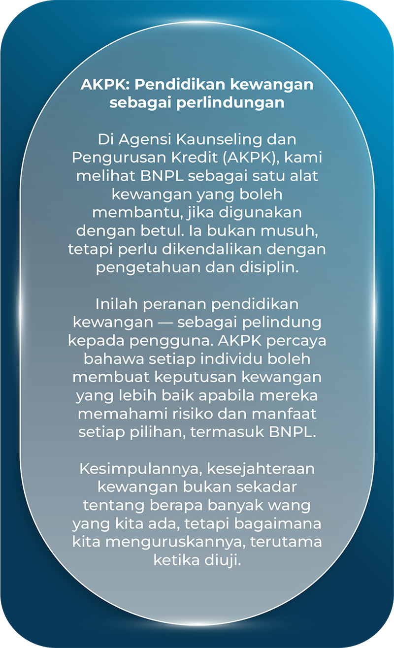 Dia sedar, BNPL bukan lesen untuk berbelanja ikut suka hati. Ia hanyalah alat, dan seperti mana-mana alat kewangan lain, ia perlu digunakan dengan bijak. Ia membantu menguruskan aliran tunai ketika terdesak, bukan menambah hutang secara senyap.