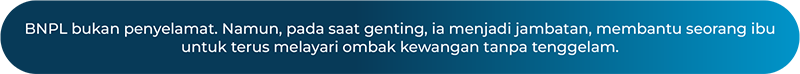 Baginya, BNPL pada saat itu bukan alat untuk membeli kemewahan, tetapi satu penyelesaian jangka pendek untuk satu keperluan penting. Ia seperti jambatan yang muncul saat dia hampir tenggelam, menghubungkan kemampuan kewangannya dengan impian kecil anaknya.