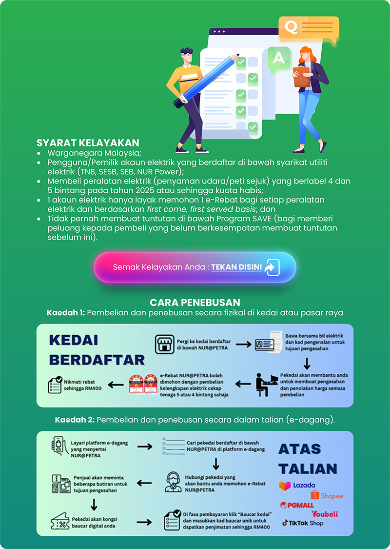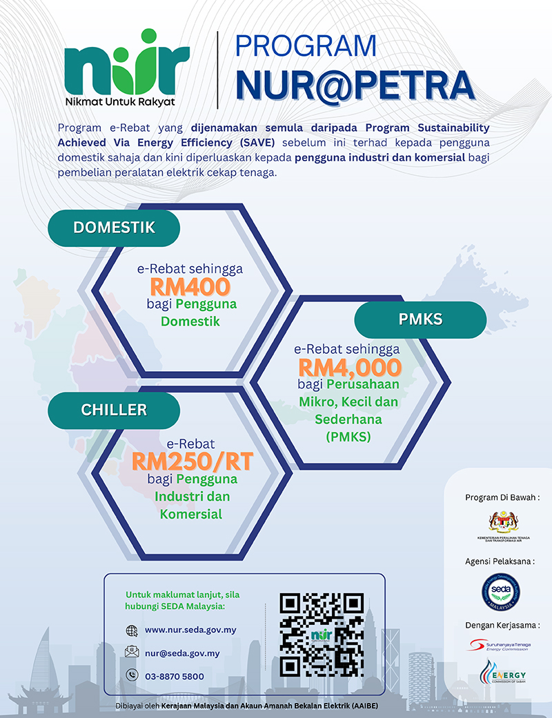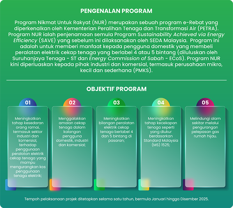 Program NUR ialah inisiatif e-Rebat baharu di bawah Kementerian Peralihan Tenaga dan Transformasi Air (PETRA) bertujuan untuk menggalakkan penggunaan peralatan elektrik cekap tenaga dalam kalangan rakyat Malaysia.
