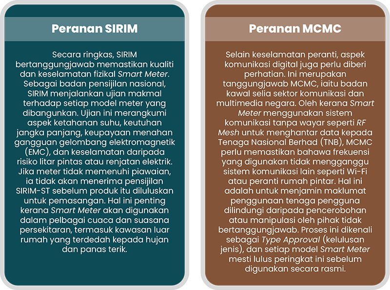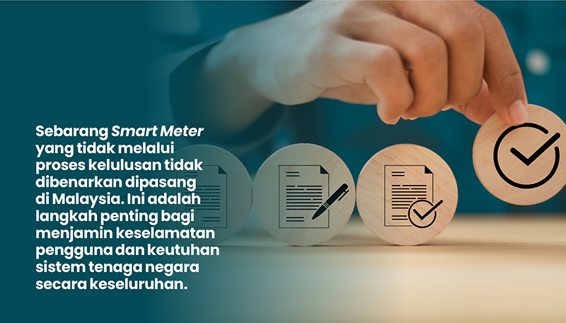 Namun, sebelum Smart Meter dipasang di kediaman pengguna, ia perlu melalui proses penilaian yang ketat bagi memastikan keselamatan, kebolehpercayaan dan ketepatan bacaan. Dalam hal ini, SIRIM Berhad memastikan pematuhan piawaian teknikal dan keselamatan peranti, manakala Suruhanjaya Komunikasi dan Multimedia Malaysia (MCMC) mengawal selia aspek komunikasi data. Seterusnya, Suruhanjaya Tenaga (ST) dan PETRA memainkan peranan penting dalam melindungi kepentingan pengguna serta menjamin kelestarian sistem tenaga negara.