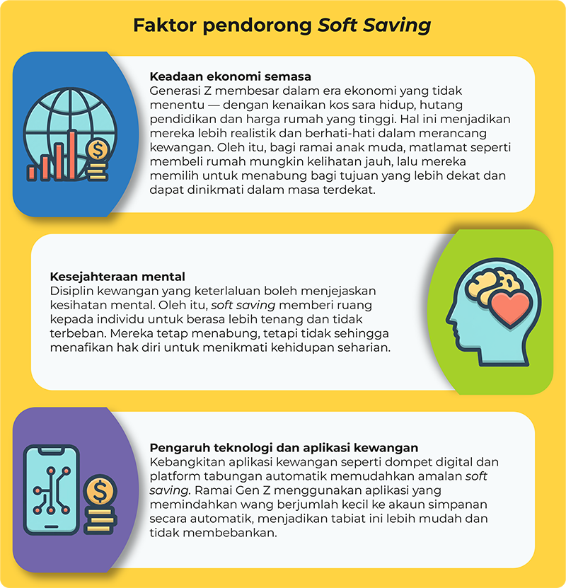 Soft saving bukan sekadar trend, tetapi refleksi daripada perubahan nilai dan realiti kewangan masa kini. Ia menandakan evolusi cara berfikir Generasi Z yang mahu menyeimbangi keperluan masa depan dengan kepentingan masa kini. Walaupun pendekatan ini lebih santai, disiplin tetap menjadi asas utama tabungan. Bagi Generasi Z, mesej yang perlu dihayati ialah: Simpanan yang kecil tetapi konsisten adalah lebih baik daripada tiada simpanan langsung. Dengan kesedaran kewangan, penggunaan teknologi yang bijak dan disiplin diri, soft saving berpotensi menjadi strategi kewangan lestari yang sesuai dengan gaya hidup moden.