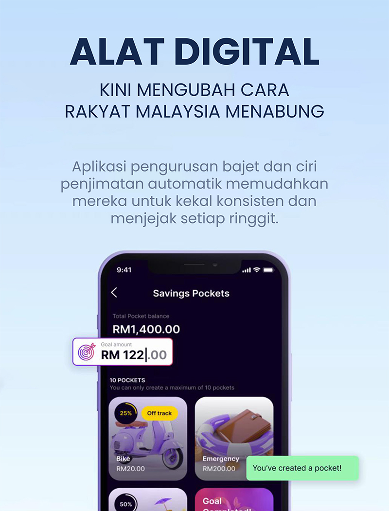 - Menyimpan baki pembelian melalui sistem round-up (contohnya, lebihan daripada RM9.50 dibundarkan kepada RM10 dan 50 sen dimasukkan ke dalam simpanan).
