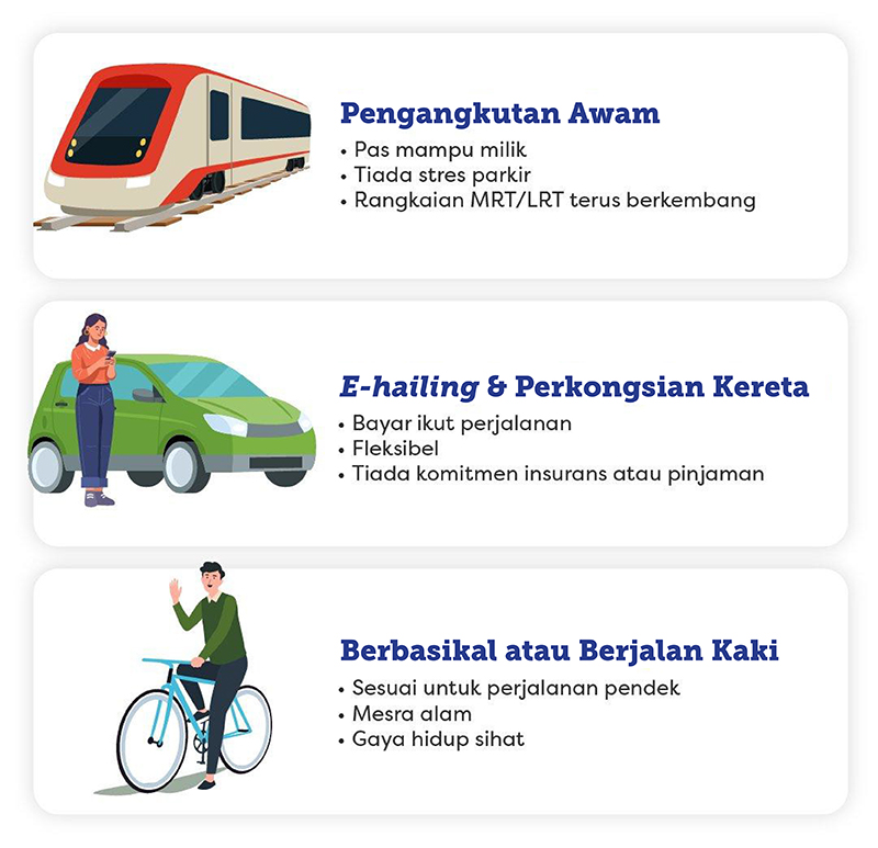 Pilihan paling bijak ialah menangguhkan dahulu pembelian kereta, bergantung pada situasi dan keperluan individu. Jika tren, bas atau perkhidmatan e-hailing boleh membawa anda ke mana-mana destinasi dengan mudah, kereta mungkin menjadi kemudahan yang mahal. Tambahan pula, menjadi penumpang juga ada kelebihannya, kerana anda tidak perlu mencari parkir, membayar tol atau risau tentang harga petrol.