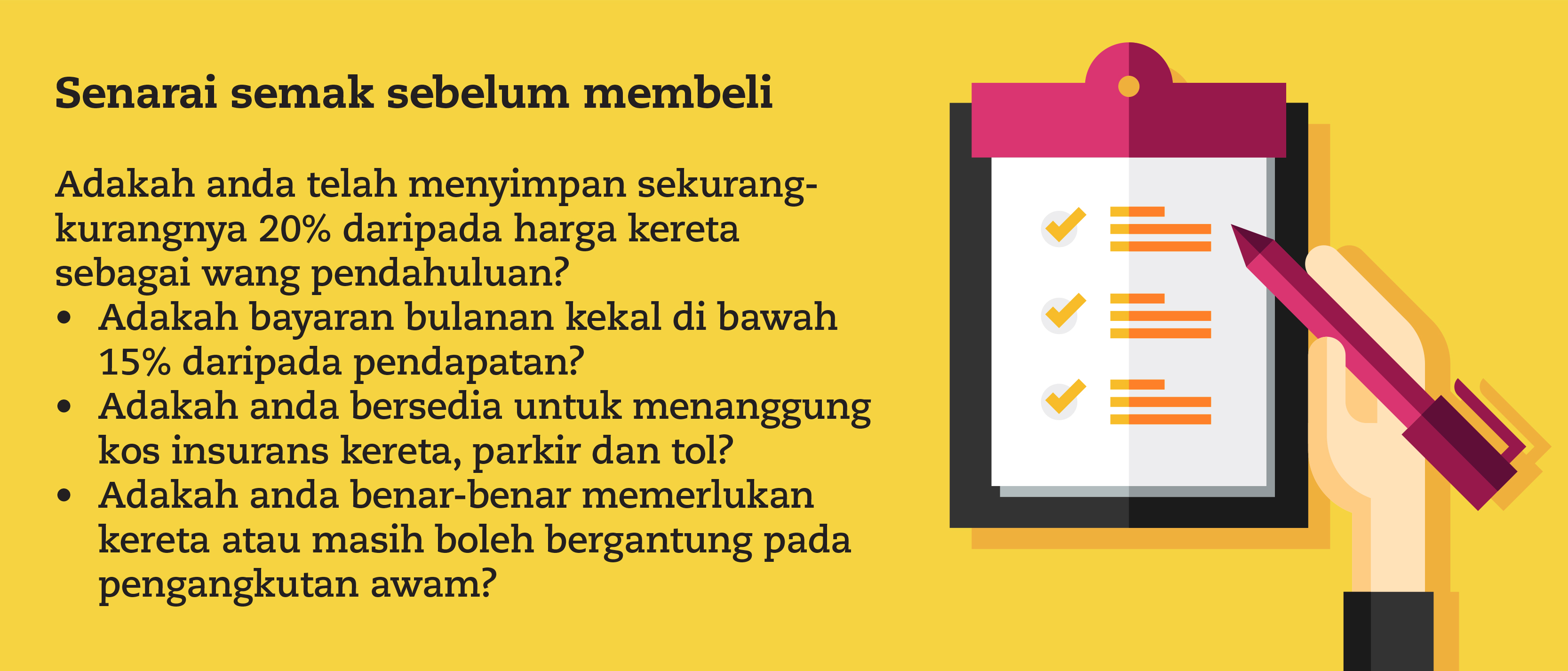 Jika kebanyakan jawapan anda ialah “tidak”, mungkin lebih baik menangguhkan dahulu dan mempertimbangkan pilihan pengangkutan lain yang ada. Apa juga keputusan anda, yang penting ialah membuat pilihan yang sesuai dengan keadaan kewangan dan gaya hidup anda.