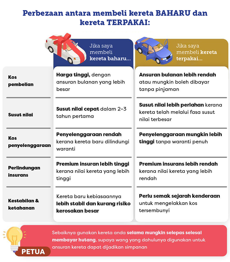 Sebelum membuat keputusan, pertimbangkan bajet anda, keperluan harian dan kos jangka panjang seperti penyelenggaraan serta insurans kereta. Kadangkala, kereta terpakai berusia 2 hingga 3 tahun sudah memadai untuk kegunaan harian dan harganya jauh lebih mampu milik.