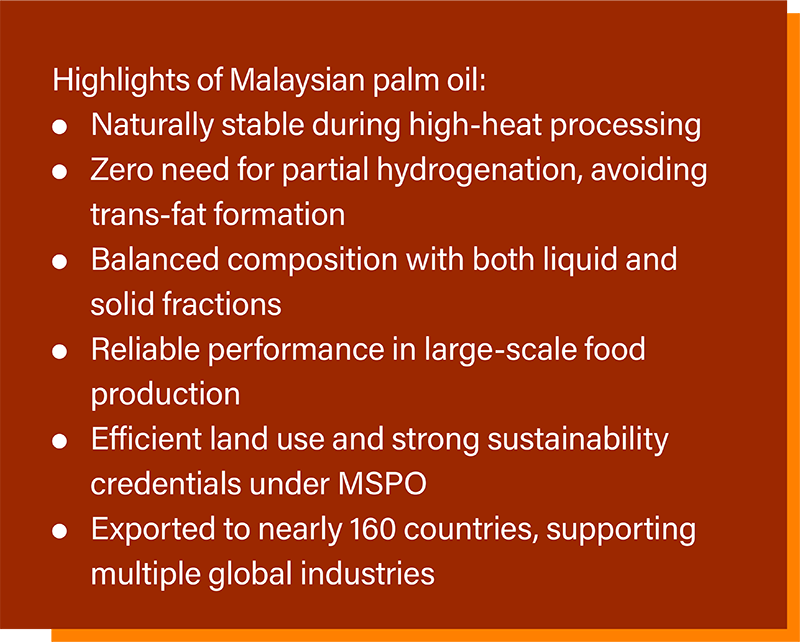 Palm oil’s functionality across food, household, and industrial applications is closely tied to its natural properties. According to food scientist Professor Tan Chin Ping from Universiti Putra Malaysia, these advantages explain why palm oil is used in everyday products, from breakfast cereals and ice creams to cosmetics and detergents. It is the most versatile and safest vegetable oil, and therefore one of the most widely consumed oils on the market.