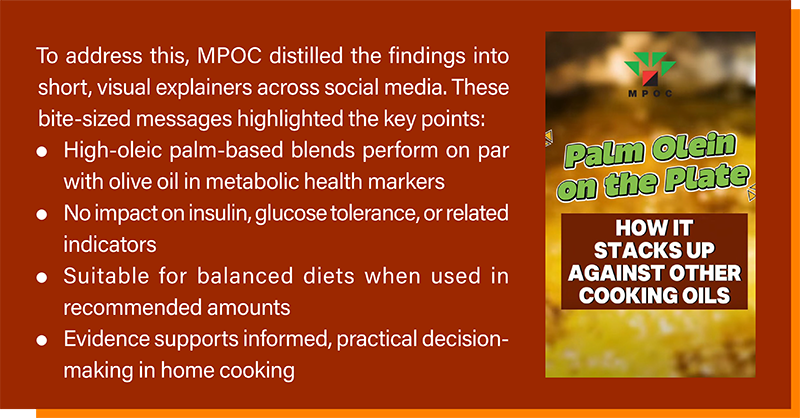 Scientific findings only influence behaviour when they are explained clearly. Technical insights from MPOB research were reshaped into formats that supported public understanding, from visual explainers to short-form videos. Some of the strongest engagement came from short-form educational content that turned scientific data into simple takeaways for everyday use.