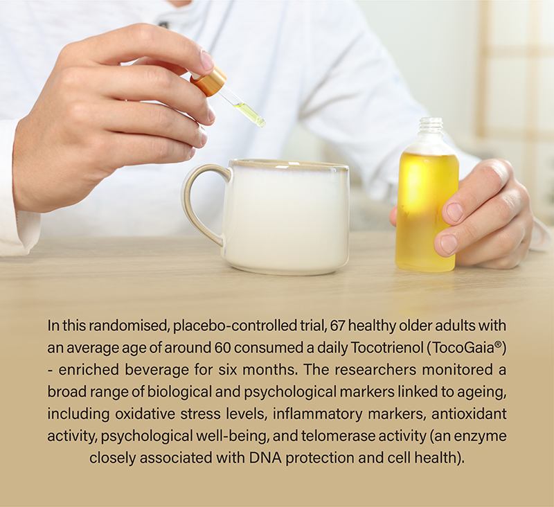Participants receiving tocotrienols also showed significantly higher activity of antioxidant enzymes, strengthening the body’s defence against oxidative stress, one of the primary mechanisms of age-related cellular damage. Notably, the study showed improved support for cellular maintenance and genomic stability, both of which are critical markers of healthy ageing. Improvements were also observed in cortisol and insulin levels, reflecting better stress regulation and metabolic balance. Participants reported enhanced psychological well-being, indicating improved emotional resilience and quality of life. Importantly, the study was also found to be safe and well-tolerated with no adverse effects reported.